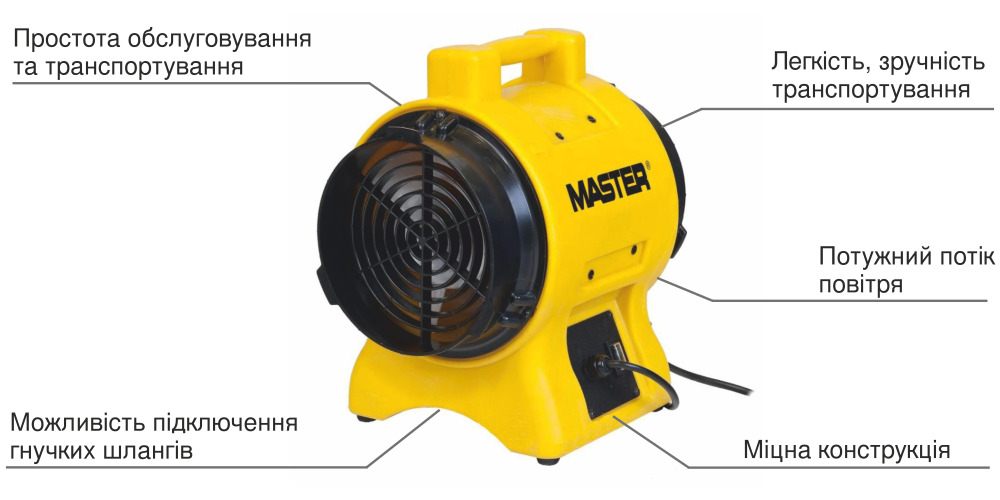 Модель промышленного вентилятора Master BL 6800 работает совместно с отопительным и осушающим воздухом оборудованием. Устройство предназначено для улучшения вентиляции на промышленных и хозяйственных площадях. В отличие от традиционных моделей вентилирующих устройств этот агрегат отличается легкой и мобильной конструкцией.