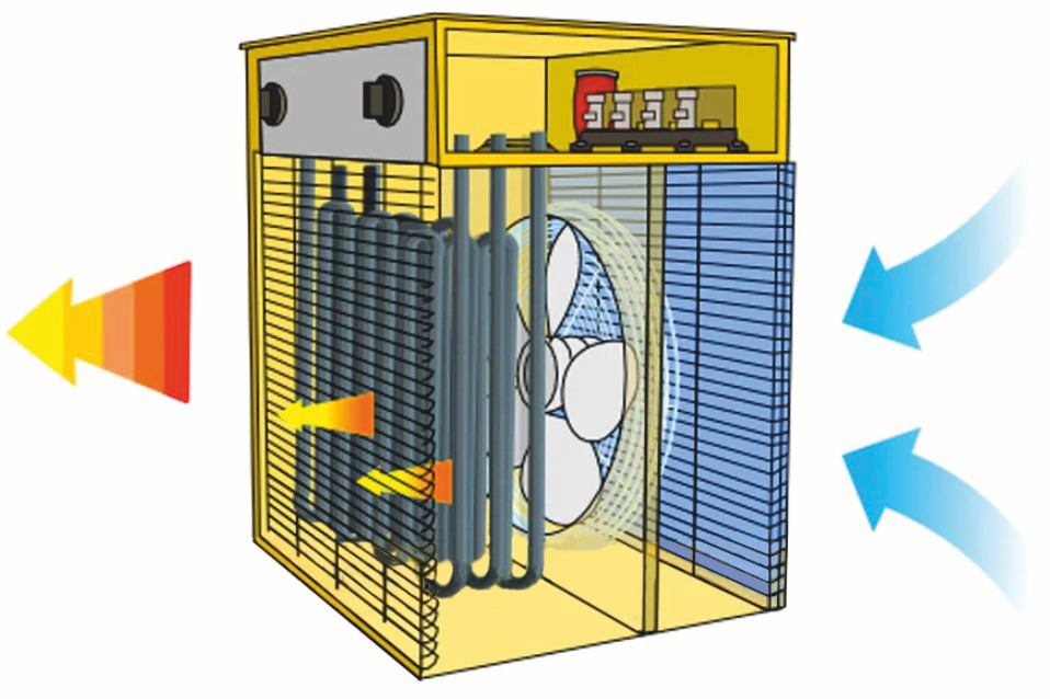 Холодный воздух с помощью вентилятора поступает в корпус тепловой пушки и нагревается, проходя горячий ТЭН из нержавеющей стали. На выходе мы получаем теплый воздух.